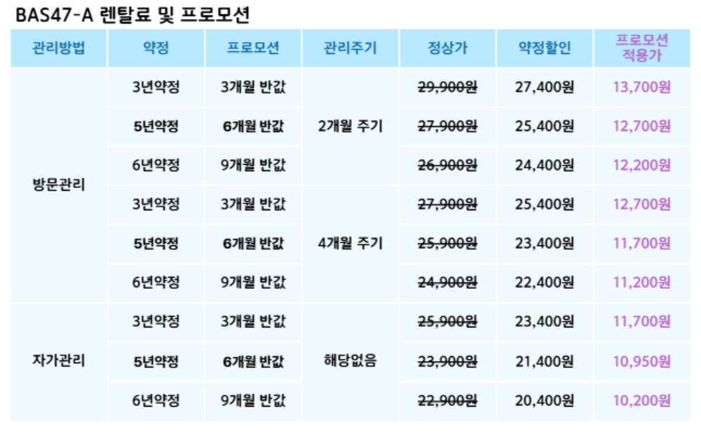 BAS47-A 코웨이 [코웨이] 스스로케어 비데 리모트2 제품분류 비데 A/S기간 렌탈기간내 최저 렌탈가 월 20,400 (렌탈가) 제휴카드 할인가 월 (렌탈가) 3년 5년 6년 자가관리 방문관리/4개월 할인 제휴카드 보기 렌탈신청 장바구니