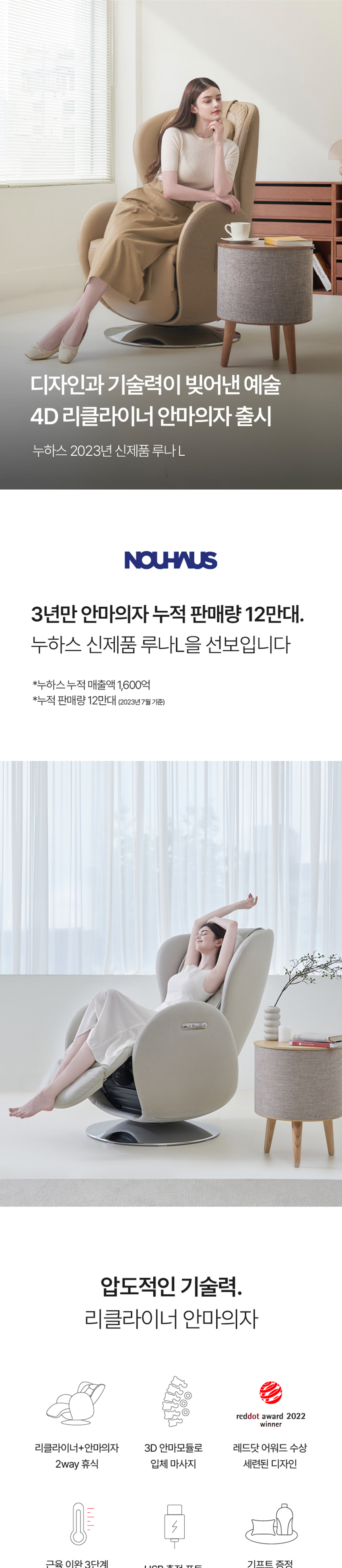 NR-SN100N-E LG헬로 [누하스] 루나L 4D 리클라이너 안마의자 엘더화이트 제품분류 안마의자 최저 렌탈가 월 63,900 (렌탈가) 제휴카드 할인가 월 (렌탈가) 3년 4년 5년 할인 제휴카드 보기 렌탈신청 장바구니
